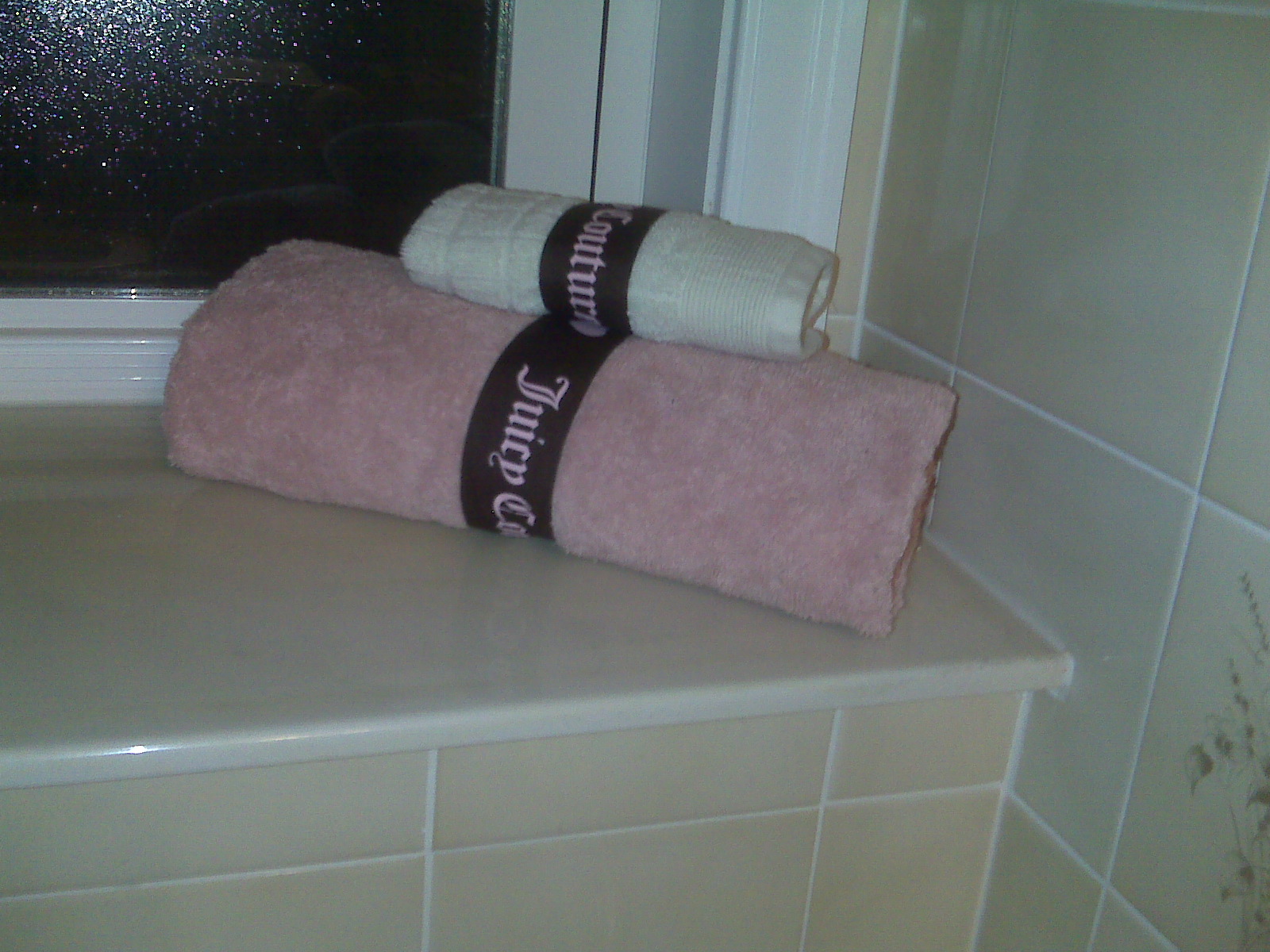 Eager to keep going, I grabbed some leftover Juicy Couture printed ribbon — which I saved after unwrapping my Christmas robe from Little Sis — and tied it around some matching towels by the tub.