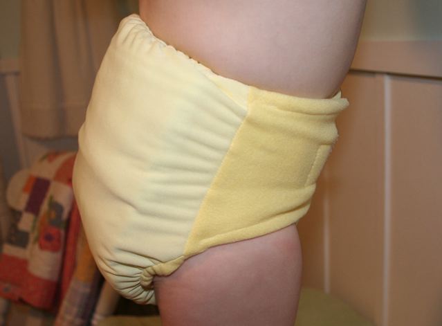 - Pocket diaper: Has an inner layer of microfleece sewn to a wet proof outer layer. There is an opening at the back where you slip in an absorbent pad. Because it is two pieces, it dries really fast out of the wash.