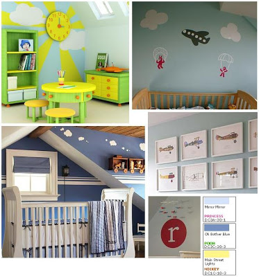 If Little Baby is a boy, I want to go with an airplane theme — blue, white and yellow, with painted planes and clouds on the walls. Plus, I love this clock-as-a-sun idea, and putting his initial in a cool painted circle: