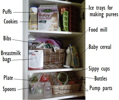 I keep all of Jacob's stuff sorted with our stuff … spoons in our utensil drawer, etc. He the has one shelf for bibs, bottles and misc. Works for us 🙂