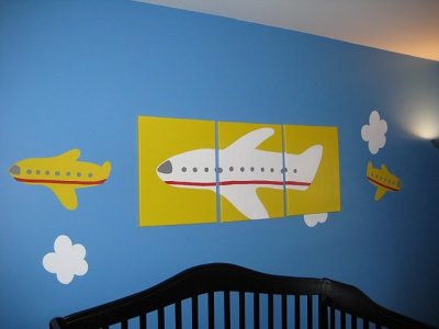 I bought three big canvases and painted a plane across them — leaving a little gap between each one makes it more interesting. Darling Husband painted the walls a bright sky blue, and I painted white clouds and yellow airplanes on the walls. I made the quilt from different fabrics (yellow, red, and blue) that had subtle patterns.