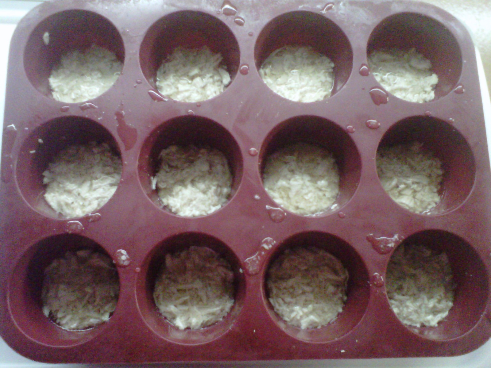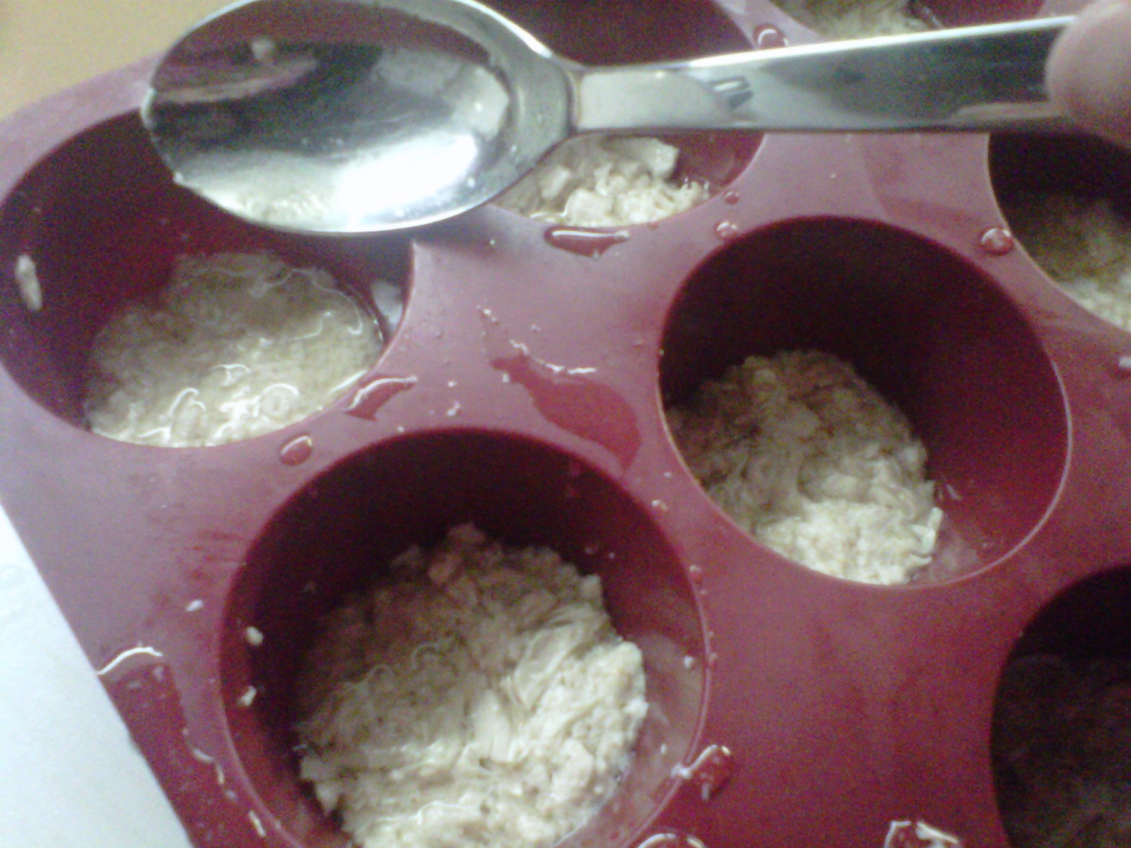 | Scoop the chopped chicken into ice trays or a silicone muffin pan. |