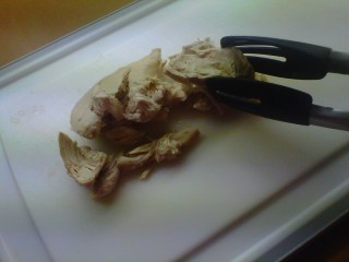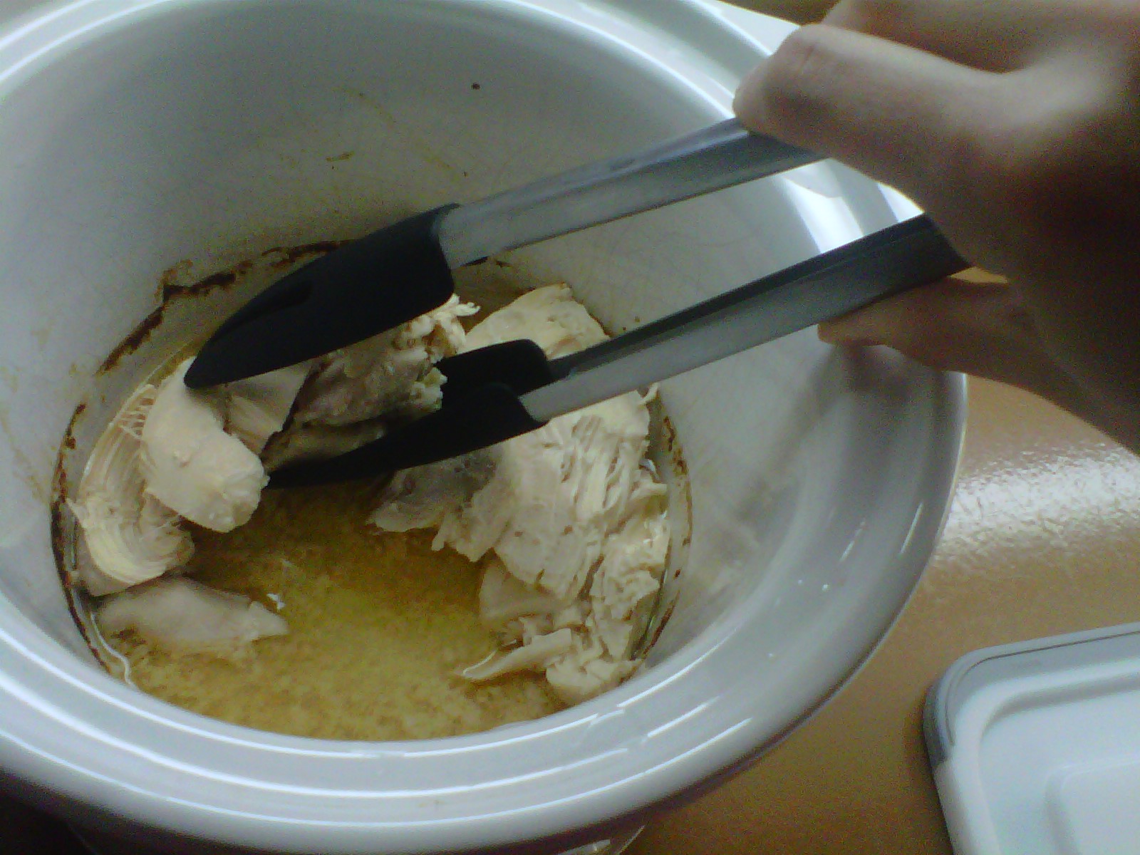 | Cook two boneless chicken breasts in a slowcooker 1 cup water. |