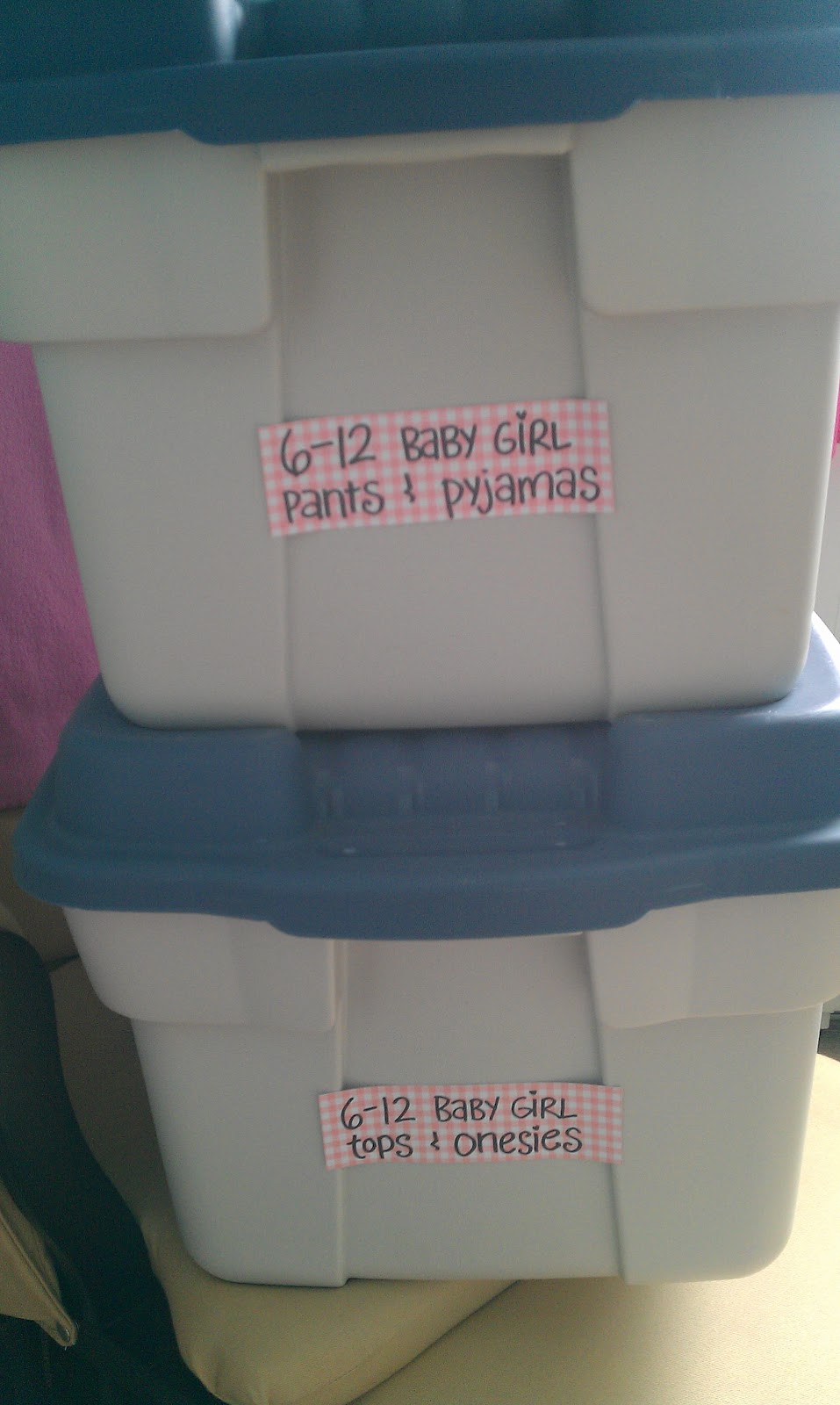 The 6-12 stuff won’t be needed for a while — and there’s way more of it — so it’s stashed in larger totes that will live in our master closet for now. They are also organized by “type” (pants and PJs in one bin, tops and onesies in another).
