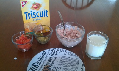- Cautiously scoop a small amount of tuna onto a Triscuit, and precariously add two hunks of tomato and two hunks of chopped pickle.