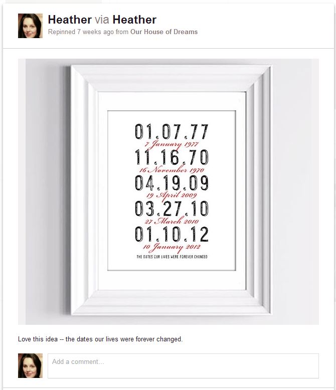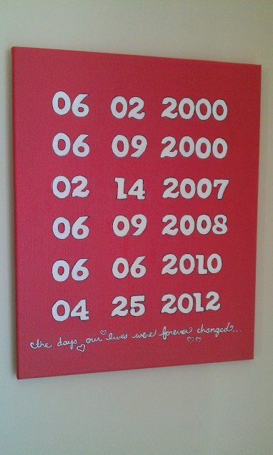 Here’s my original inspiration that I pinned. It’s a way to display the special dates in your life (when you got married, had your babies, etc.) …