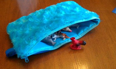 I stored all of the little plastic farm animals in this fun fuzzy pencil case. It has a beanbag sort of thing happening on one side of it, so D loves to use it as a pretend pillow.