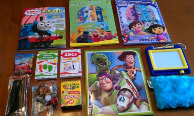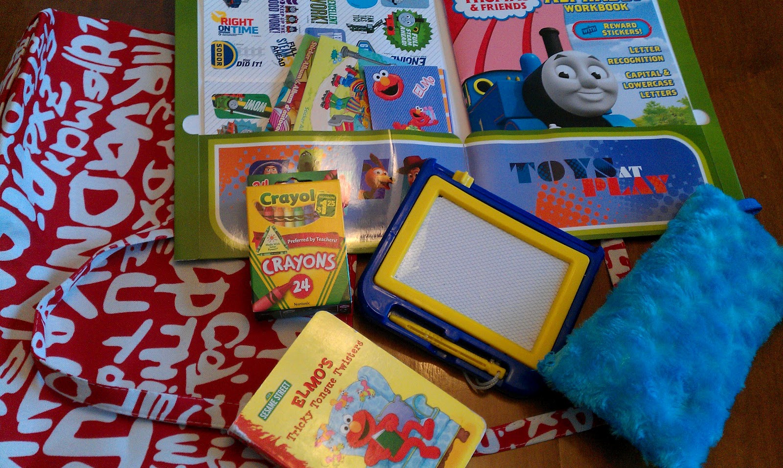 Here’s the haul! It includes sticks, an activity book, crayons, little toy animals, and his very own lip balm. (You can see flash cards in this picture, but I ultimately decided to keep them at home, because mess = ugh)
