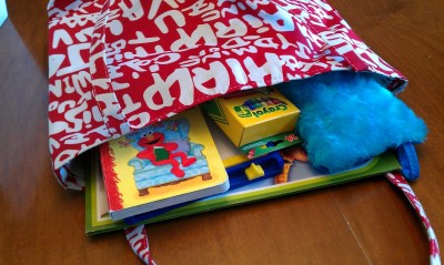 I took all of the stickers and the activity book and put them in this cute Toy Story folder. This eliminated all of the crinkly noisy packaging, so D won’t disrupt his fellow parishoners. I can also add a few new pages ripped from a colouring book every week.