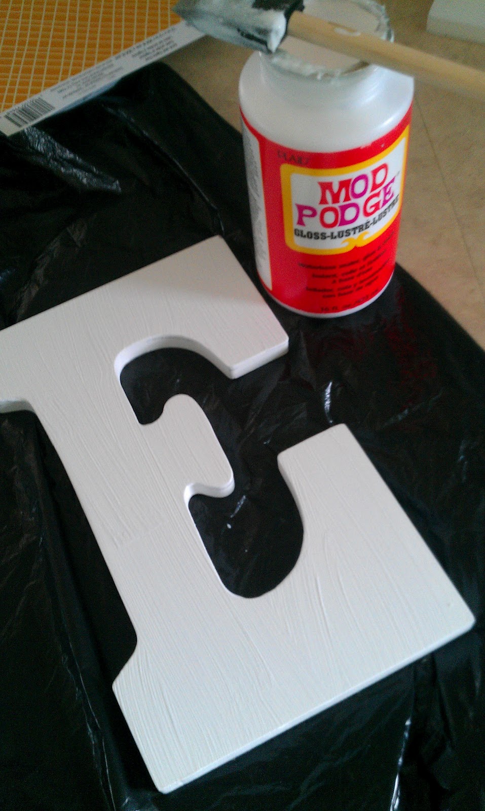 | I put a thin layer of Mod Podge (I say “Modge Podge” in my head, do you?) on the surface of each letter … |