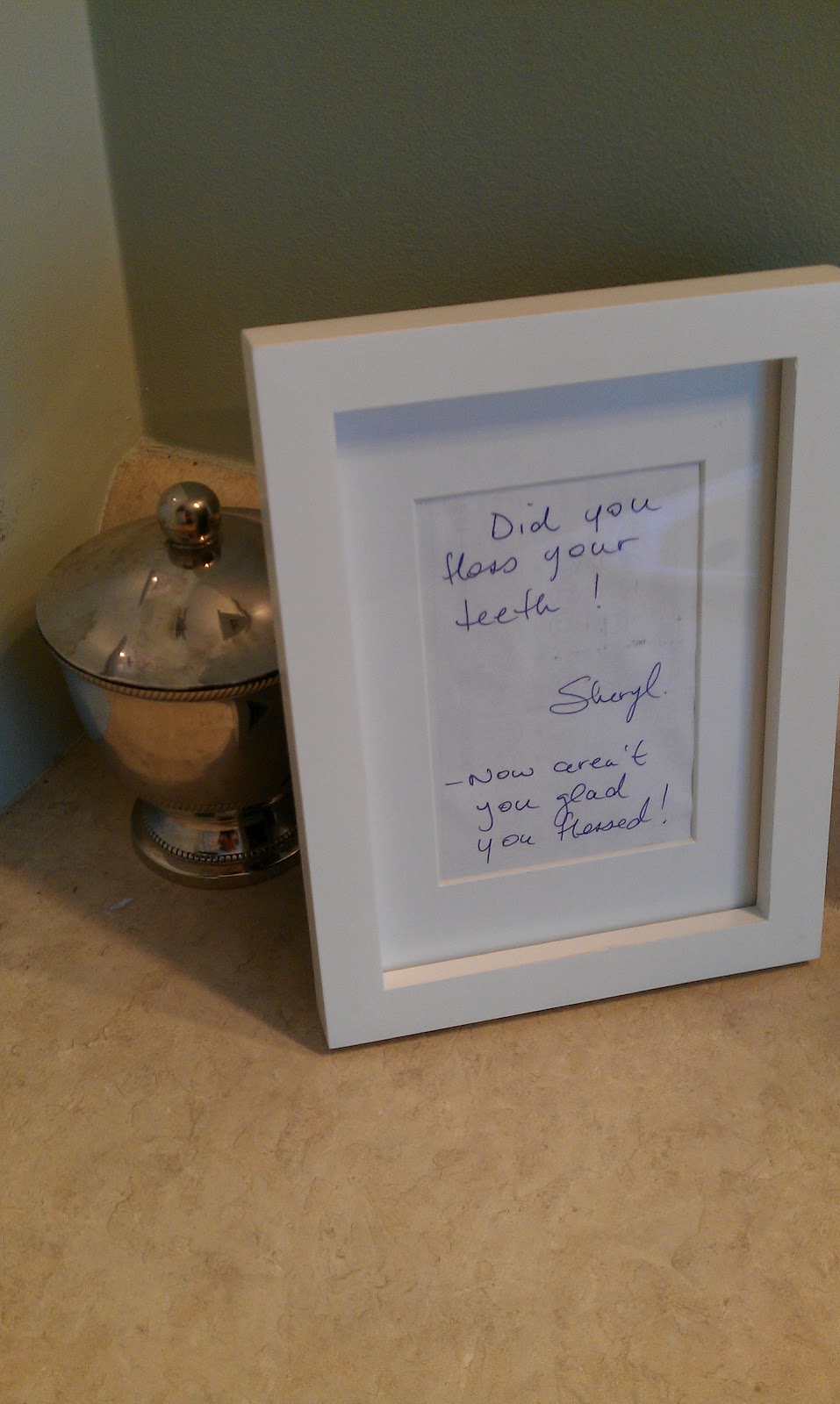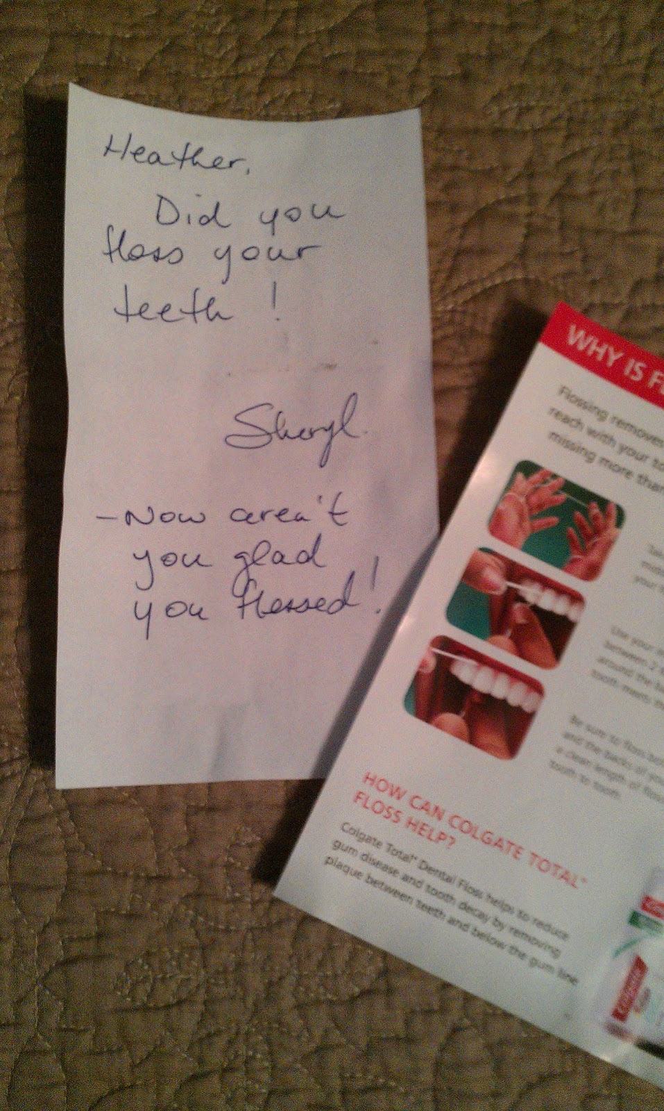 The hygienist laughed, but she did both things for me. I stuck the note up on my bathroom mirror, and it really did help me remember to floss.