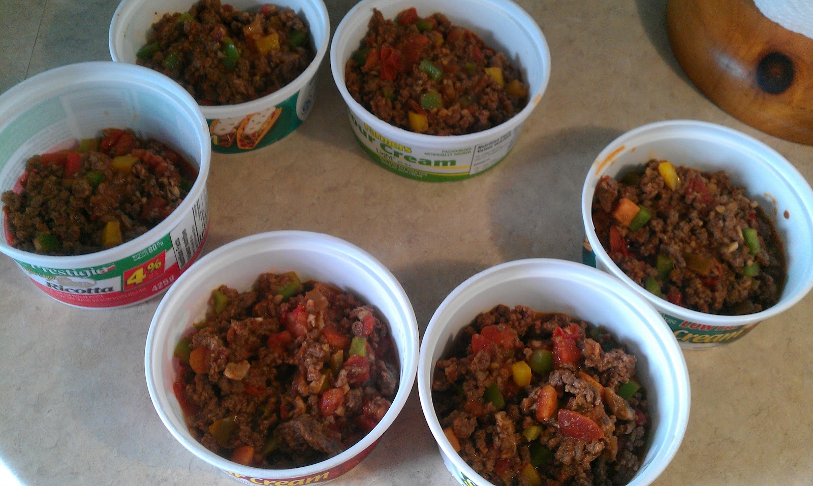 Here are our six servings of taco meat (Two-year-old D will eat half a serving for lunch, and half for dinner)