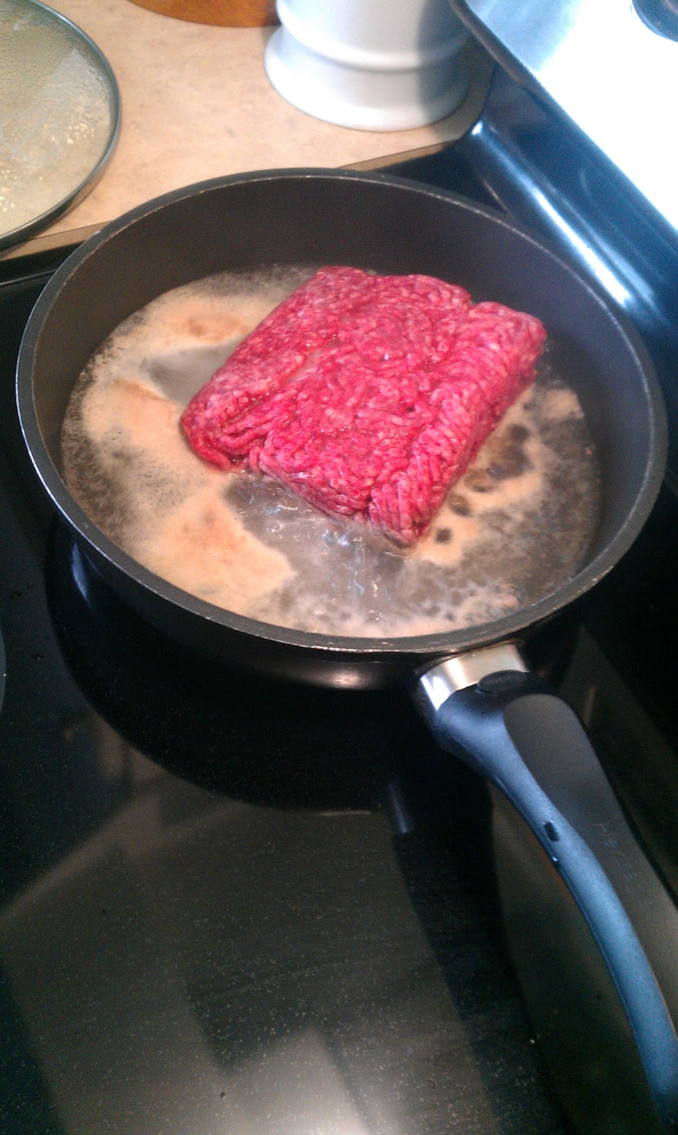 Brown 1/2 pound of lean ground beef (ours was frozen, so we added water to the pan)