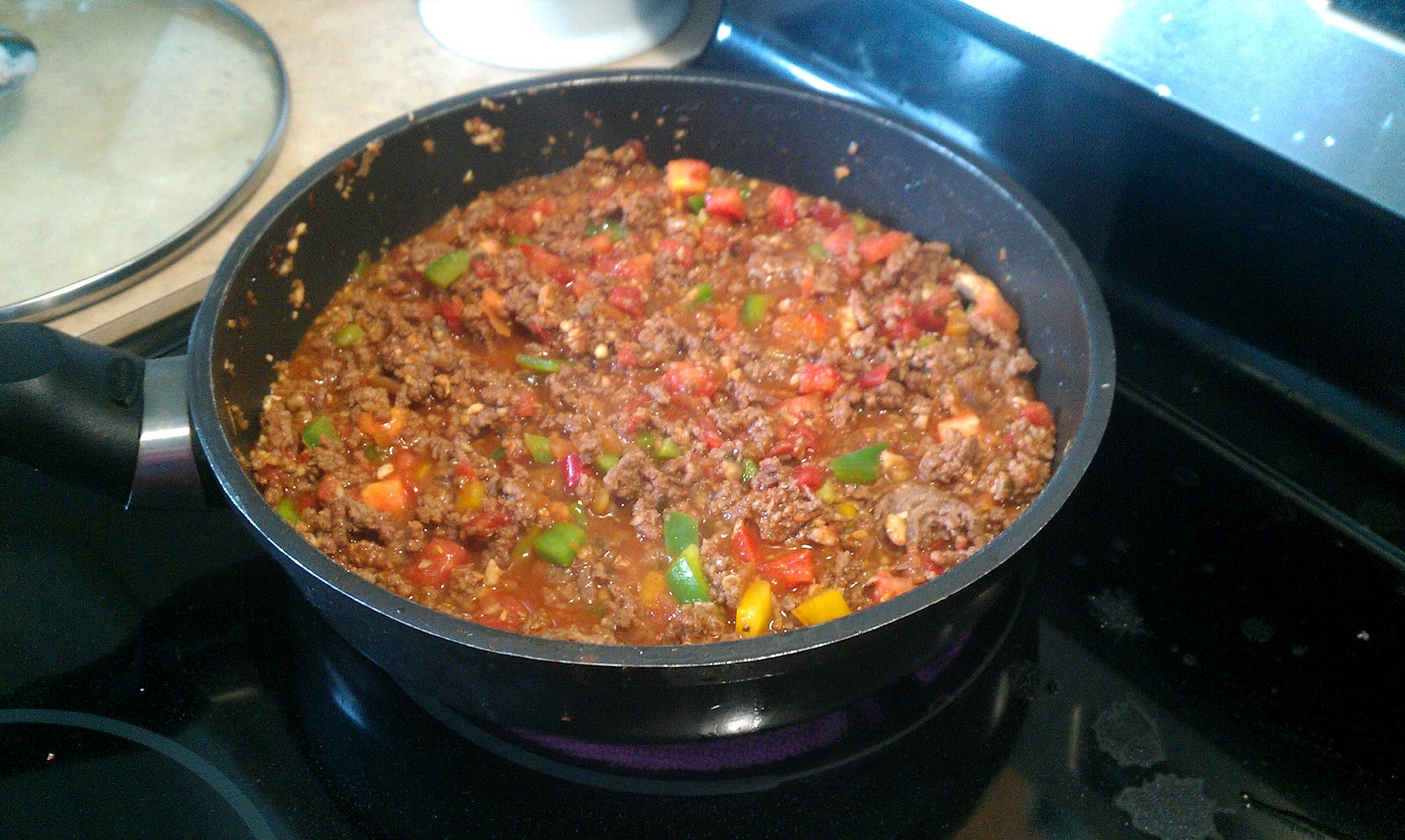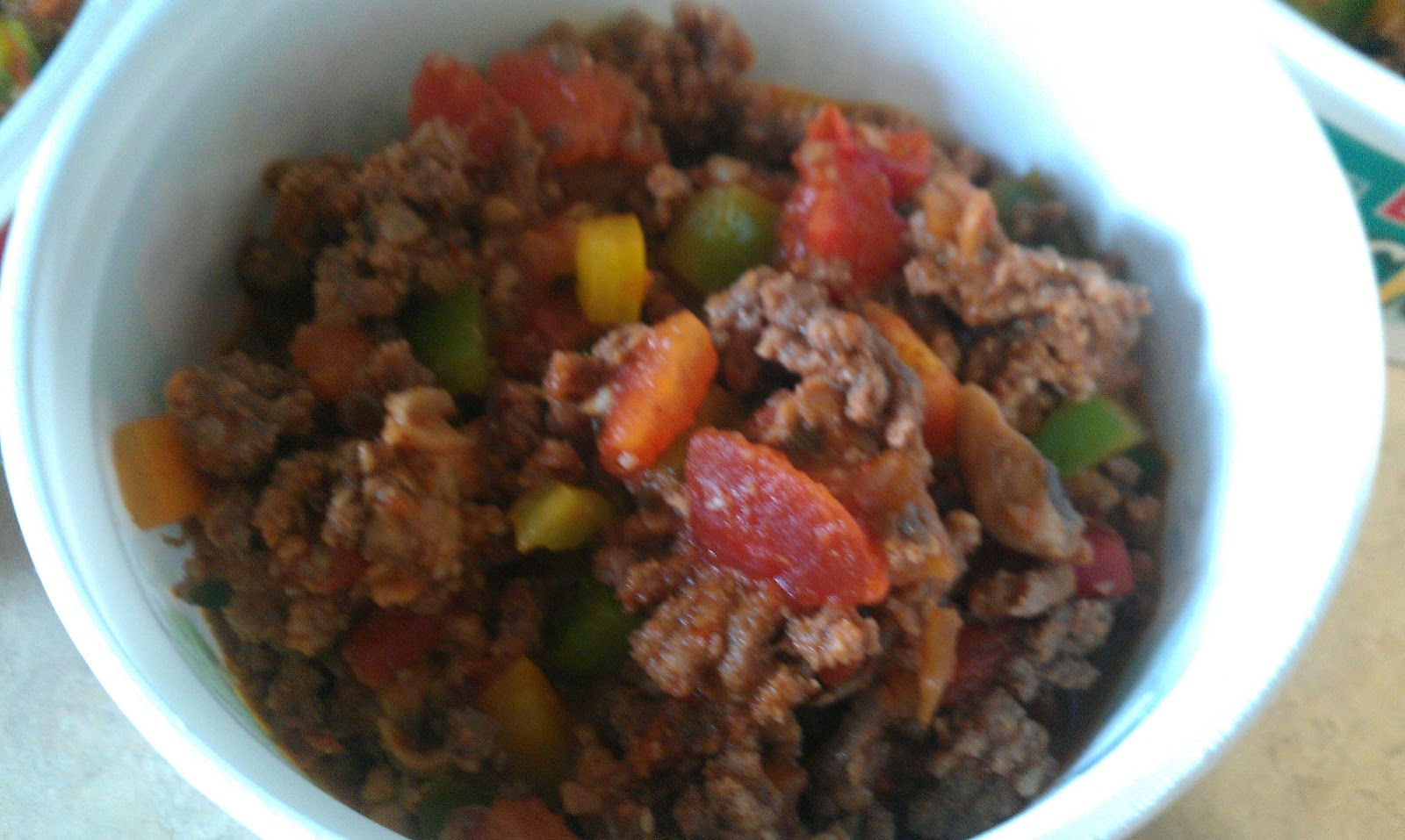 Once you drain the ground beef, throw in your spices and veggies. I also throw in some salsa, because ZERO POINTS, BABY! Throw in as much salsa as you want! LIVE! (Oh, right, and cook for a few more minutes)