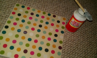 | I used Mod Podge to stick the paper to the canvas. It freaked me out by bubbling a bit, though (eeeeeeek) so if I was doing it again, I would probably just glue it down. |