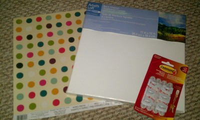 | I bought a 12×12 canvas (half-price at Michaels thanks to a coupon), one sheet of cute scrapbook paper, and a package of Command hooks |