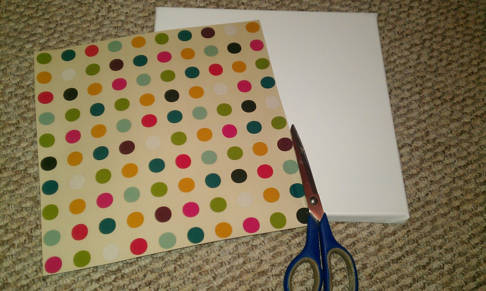 | I used Mod Podge to stick the paper to the canvas. It freaked me out by bubbling a bit, though (eeeeeeek) so if I was doing it again, I would probably just glue it down. |