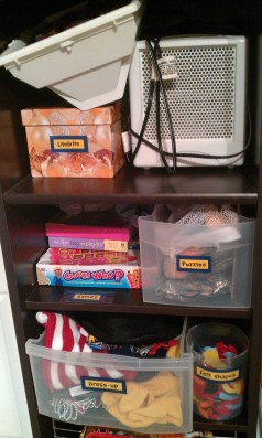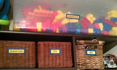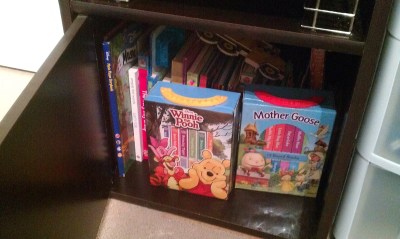 | Most of the kids’ books live upstairs in D’s room, but we keep a small sampling in the basement. We used to keep them on a shelf, but it was waaaaay too messy. Now they’re tucked out of sight, so I don’t care if he just shoves them all back in. |