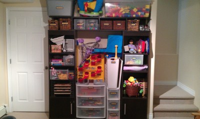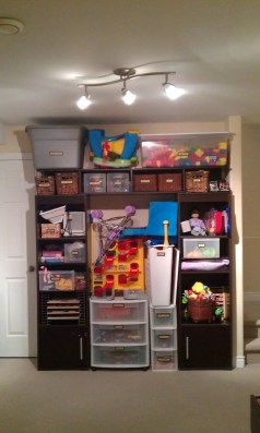 Here is our latest accomplishment — taking items we already had (like an old entertainment unit), wrangling ALL of the kids’ toys and creating a “toy wall” in our basement, to keep them all in one place.