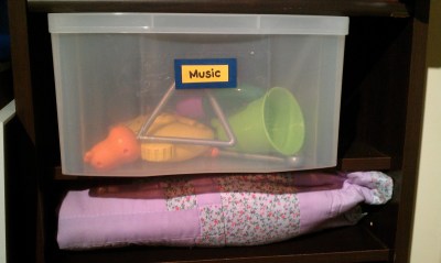 | My friend A laughed at my “broken toys” bin, but we need it! D is always breaking little pieces off his cars, so I need a spot to stash them until I can glue them back on. |