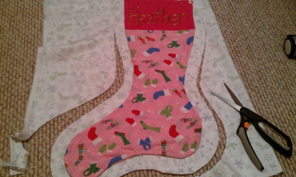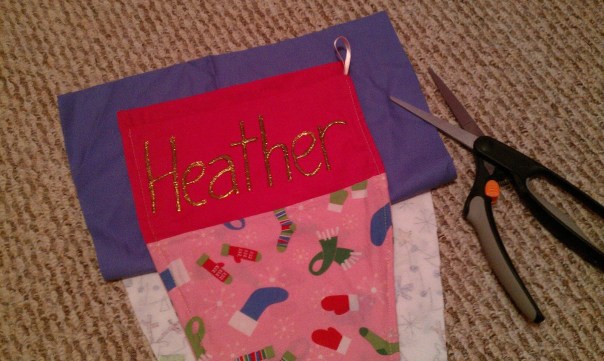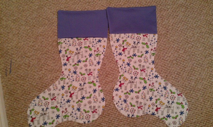 | Sew the two “bad” sides together, turn inside out, and TA-DA — stocking for C! |