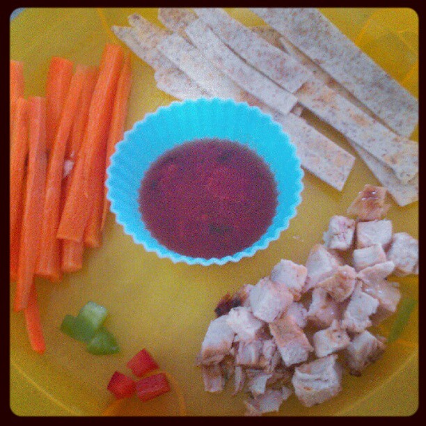| Usually D eats regular chicken wraps, but I guess I served deconstructed chicken wraps on this day (better for dipping). Notice the tiny piles of peppers for him to try? |