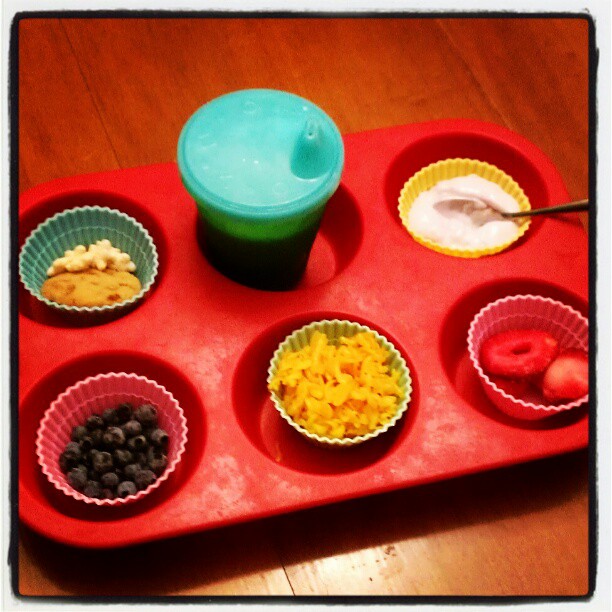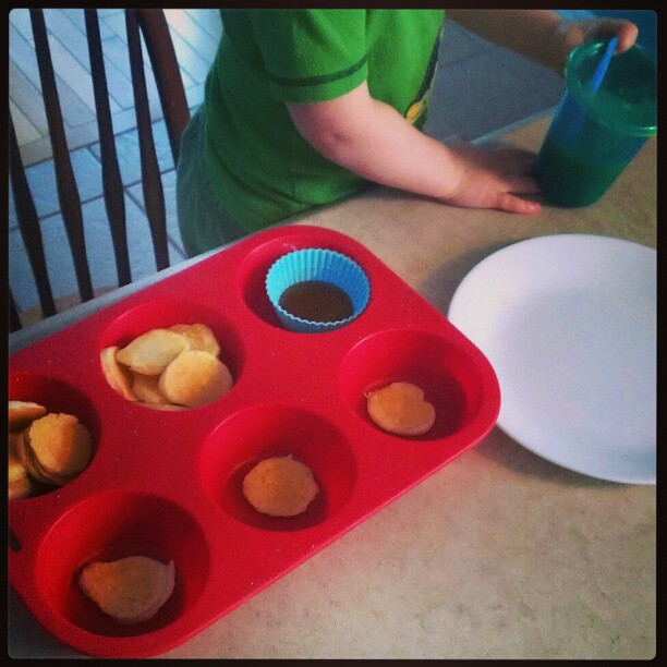 - They get a kick out of different containers and dishes. D loves eating out of muffin tins, but he also just likes when I use silicone muffin liners as cups or holders.