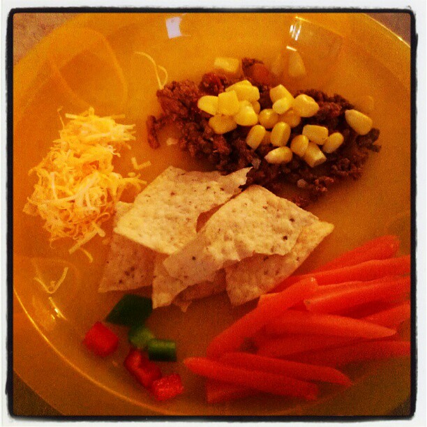 | Deconstructed nachos. I slice up D’s baby carrots if they’re too fat, so he doesn’t choke. Once a worrier, always a worrier! |