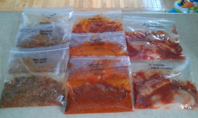 I knew I needed to do SOMETHING to make dinner prep easier on myself, but I honestly don’t have the time/effort at the moment to really investigate some awesomely creative Pinterest slowcooker meals (that we’d actually eat), so yesterday I threw together eight meals’ worth of food that we actually eat all of the time.