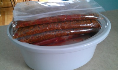 | I folded each bag in half so it’s the perfect slowcooker size, stacked ’em up, and asked Darling Husband to carry them downstairs to our deep freeze. DONE! |