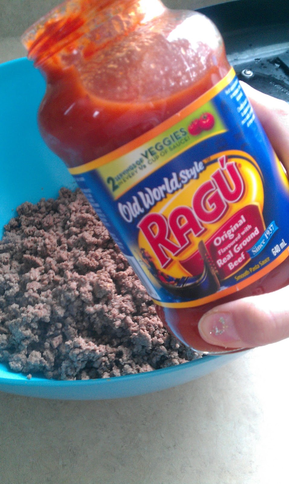 | … and added two jars of super-fancy Ragu pasta sauce! (I warned you — I’m not a very good cook yet!) |