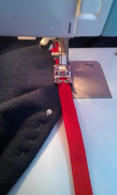 | Then I sewed the red ribbon along the edge as I hemmed it — that’s what I called two-for-the-price-of-one seam-sewing! |