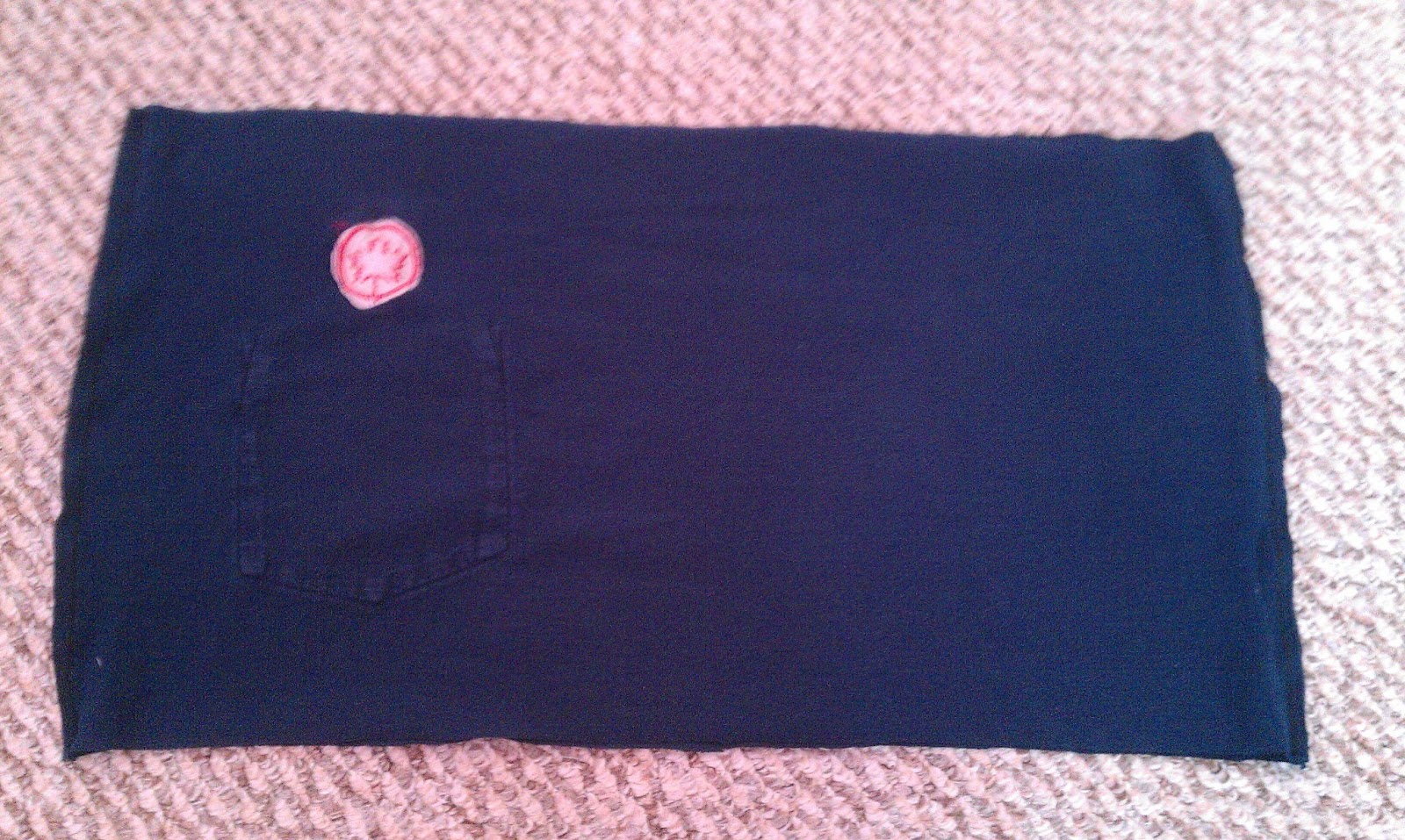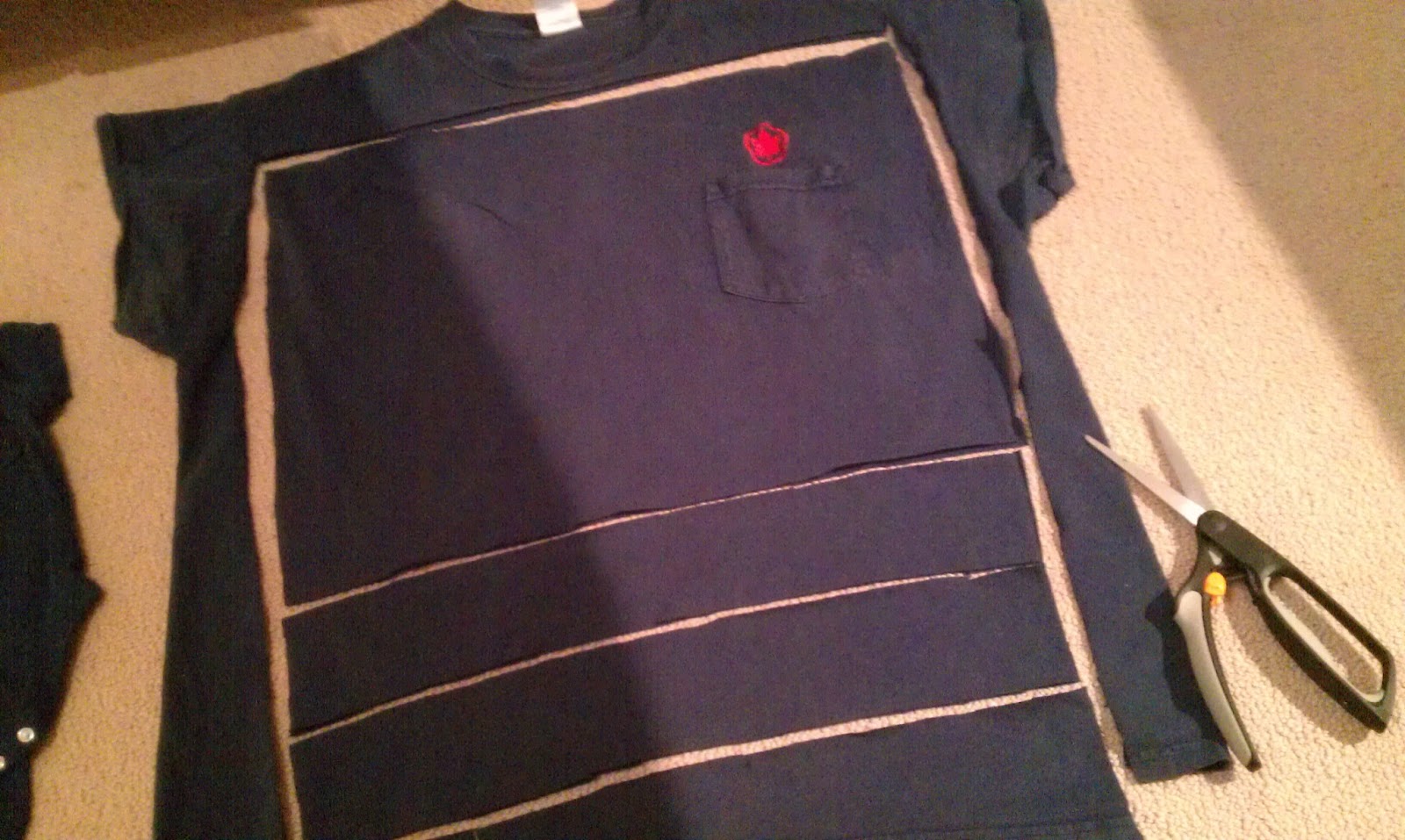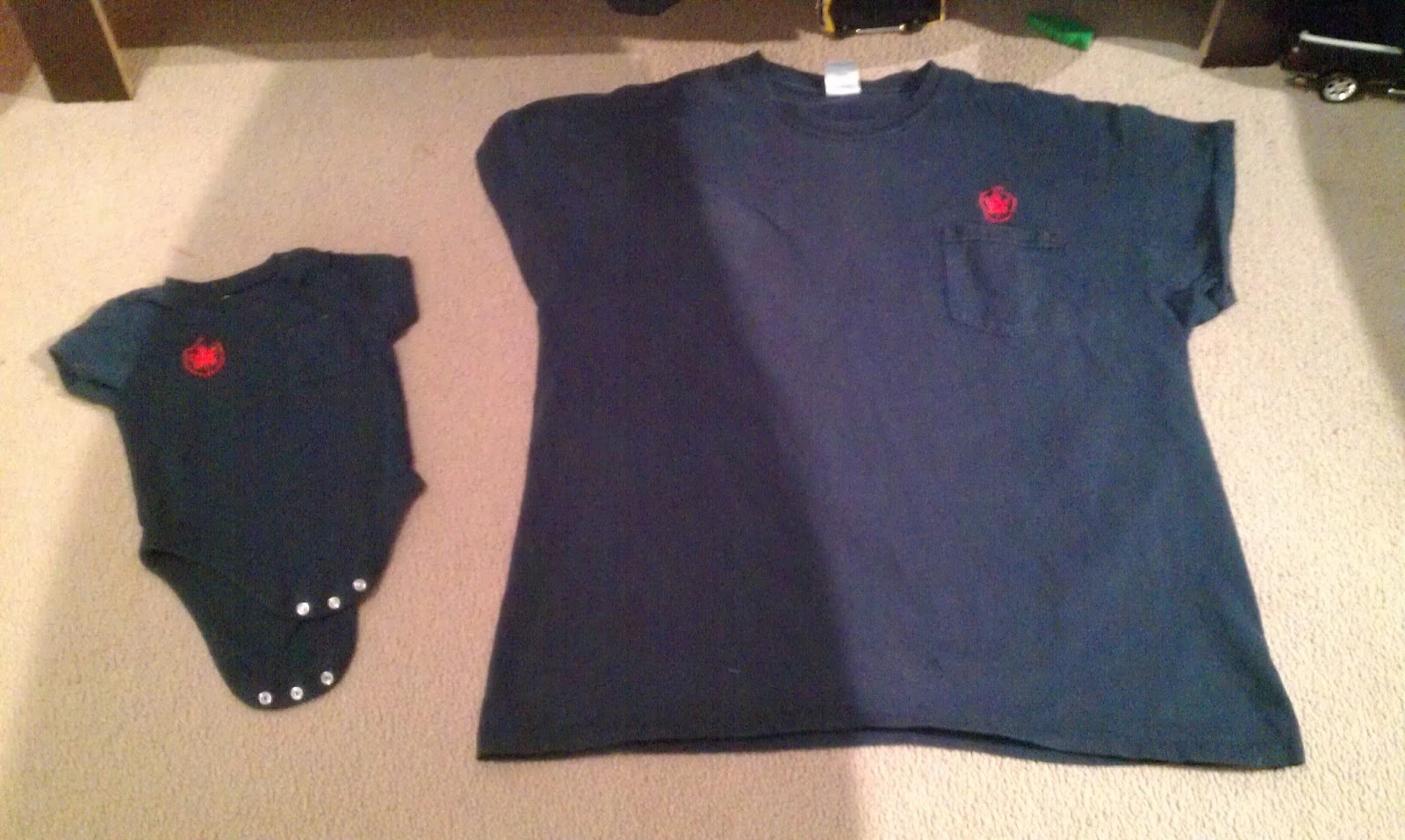 | Here’s where I started — one 6-12 month onesie (already appliqued with the logo) and one of Darling Husband’s old uniform shirts |