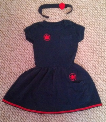When our daughter, C, came along, I knew she’d need her very own mini-version of Daddy’s uniform. So I took D’s old onesie and decided to turn it into a dress — complete with matching headband!