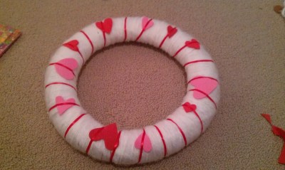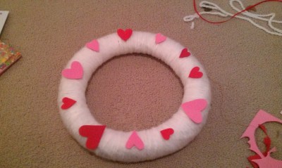 So I put Baby C down for a nap, grabbed this shiny-wood (straw?) wreath that I’ve had in my craft closet for ages, took a ball of white yarn (also hoarded for no apparent reason) and my container of foam sheets. Then D and I settled on the basement floor to put together a Valentine’s Day wreath.