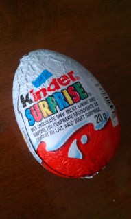 Kinder Surprise, her fave (I’ve heard my American readers can’t get those? Because they combine chocolate and a toy, and that’s, like, illegal down there? Shame)