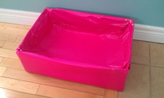 I grabbed a cardboard box, cut off the flaps, and put them on the bottom to make it sturdier — there was going to be a bottle of wine and a 2L bottle of pop inside!