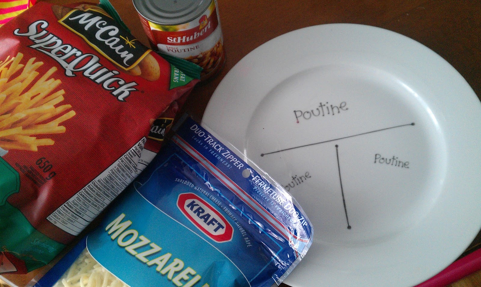 Ingredients for her fave food, poutine (and a plate I made using Pinterest’s Sharpie trick)