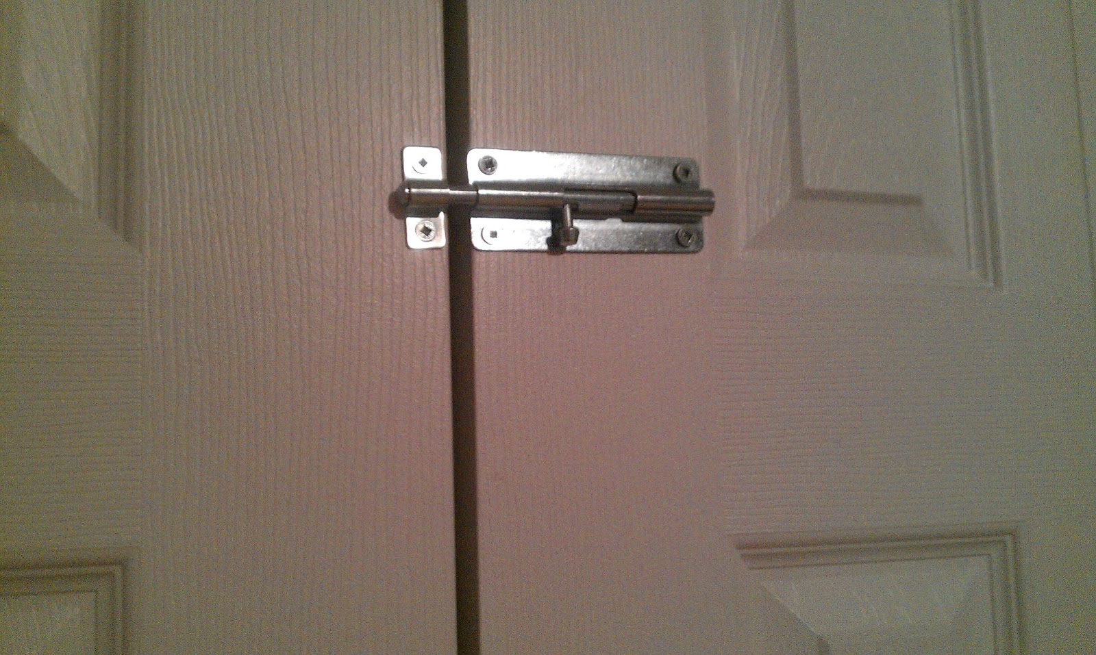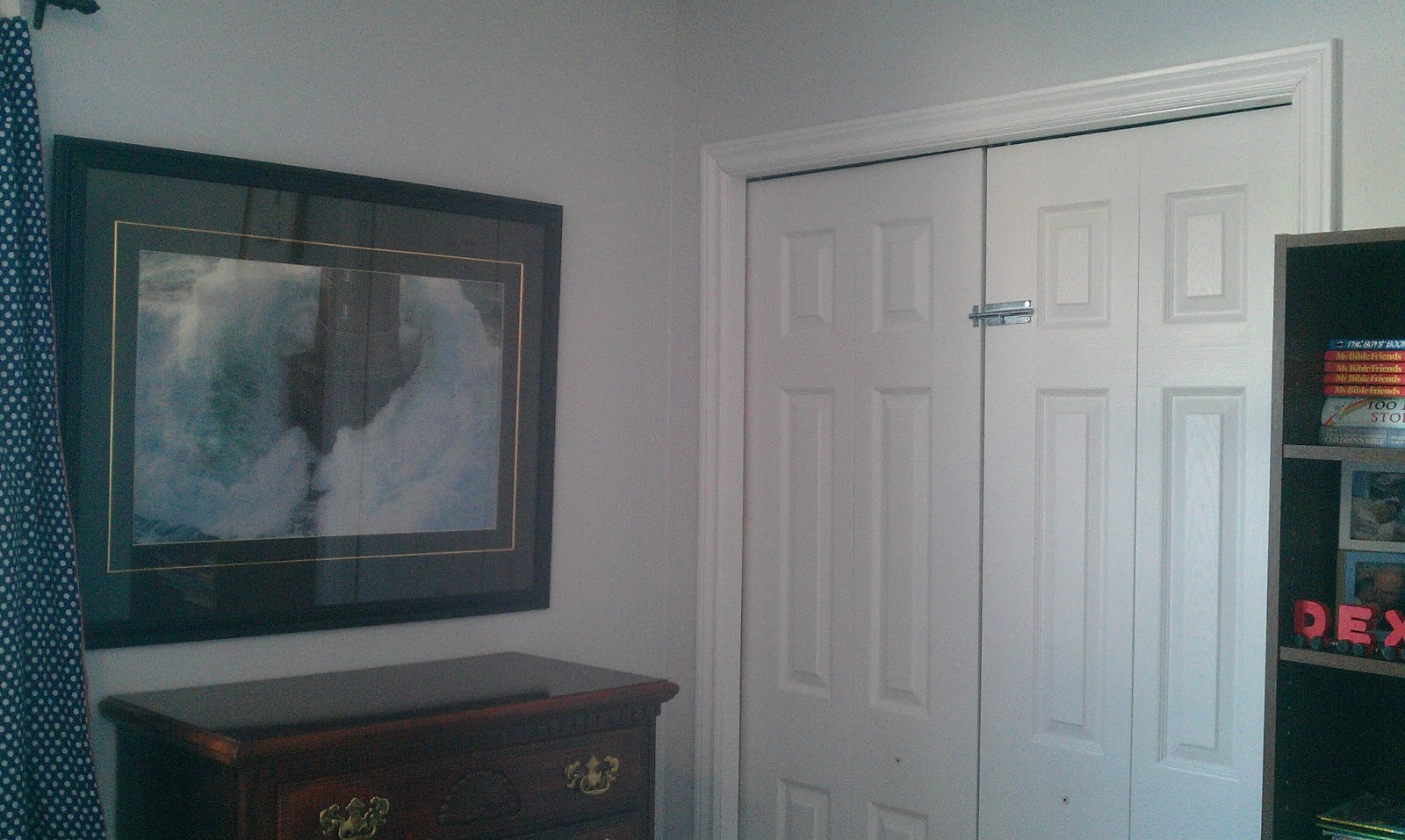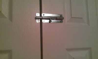 | Notice the lack of hardware on the closet? Yeah, D unscrews it on a daily basis, so it’s off for now. We did add a slide-y lock to the top, though, because he was ripping clothes off his hangers. |
