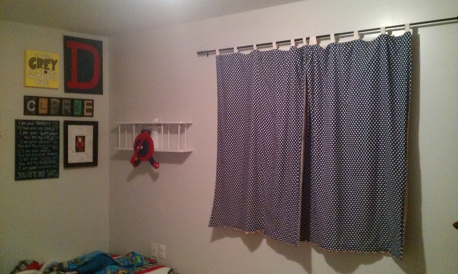 | Like the curtains? The house came with red-striped ones, so I sewed this navy polkadot fabric onto one side when we moved in. The other side is still the red strips, so I think it’s cute. |