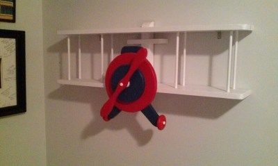 | My mom got D this airplane shelf on Kijiji (Canada’s Craiglist), and I painted it with little tester pots to match the colours of his room. |