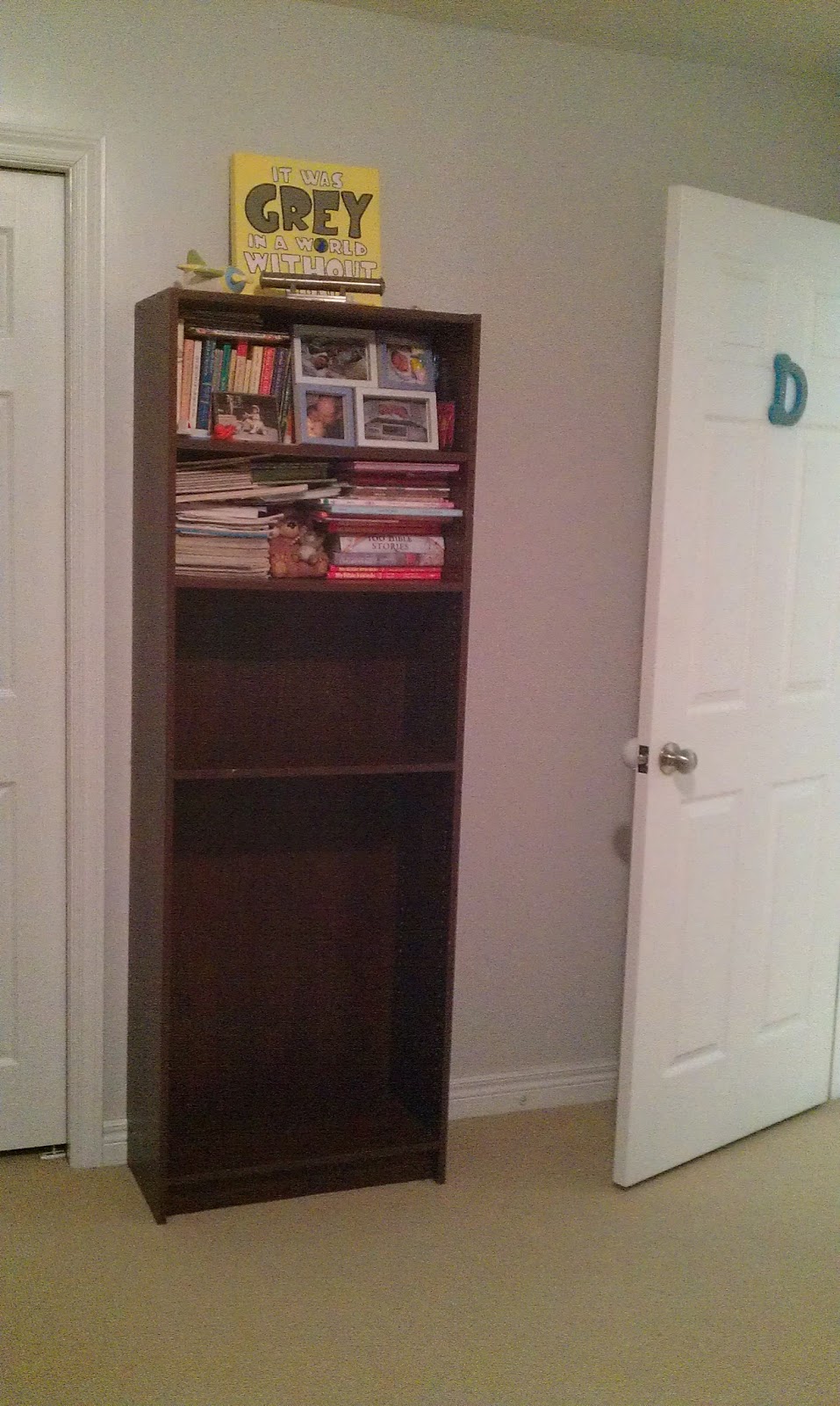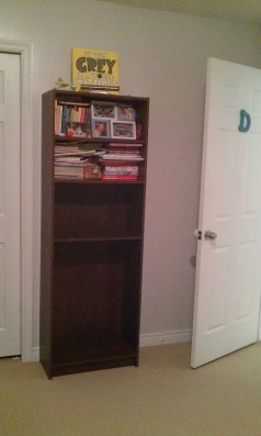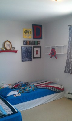 So when that was out of the way, I focused on D’s room itself. The main issue is that since he’s been, um, creative in his sleeping (i.e. under the beds, in the closet, in the dresser, on the bookshelf) and um, AWFUL in his activities (climbing furniture), his room kind of started to look like a crack house.