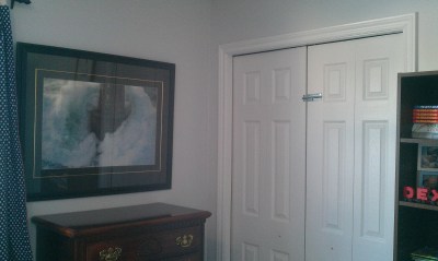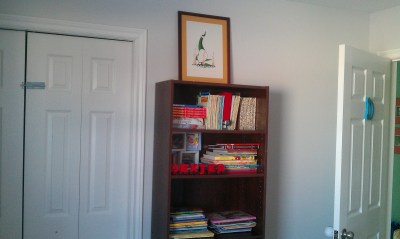 We put D’s dresser back in his room, and used mega-super-duty bolts (or something like that) to anchor it to the wall. We also hung this framed print that we’ve had for ages, that I hate and Darling Husband loves but doesn’t go anywhere in our house. |