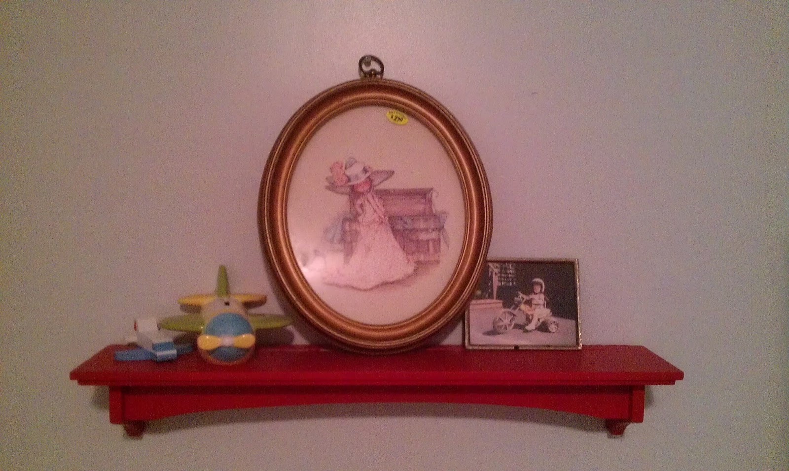 | I used this thrift store frame as a placeholder, but it’s not done yet. I’m going to spraypaint it red, put something cute in the frame, and probably remove the price tag. Probably.