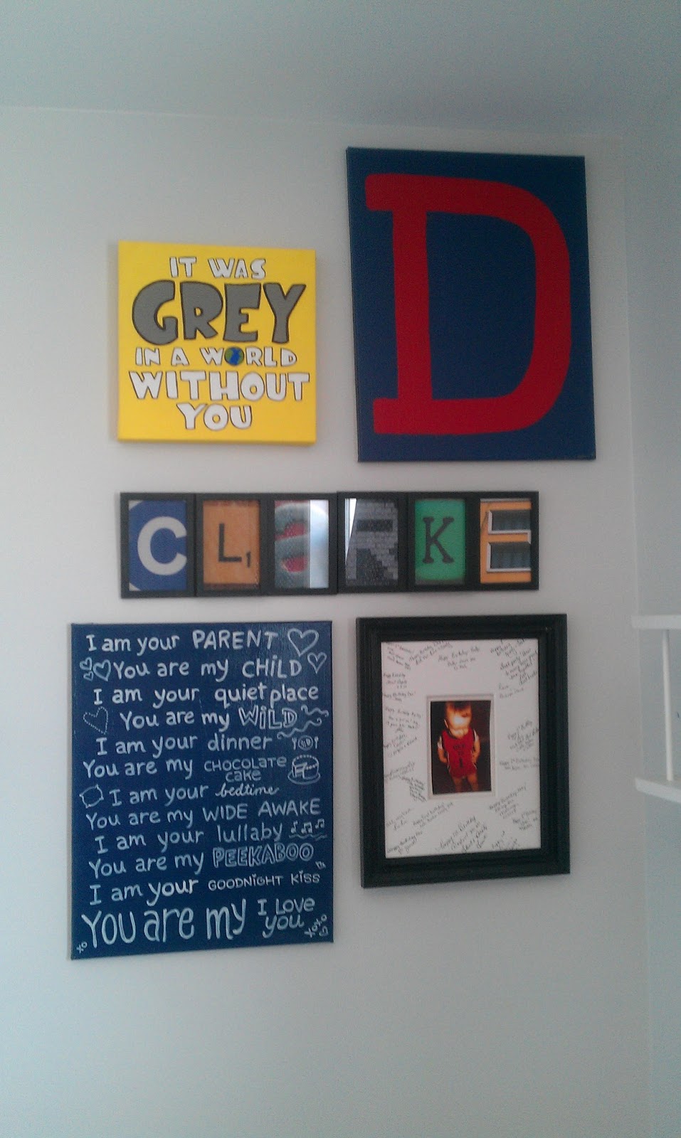 | I knew I wanted to “re-balance” the art on D’s back wall, since the airline poster got ripped down (damnit), so I made a frame collage using some paintings I made for him over the last two years. |