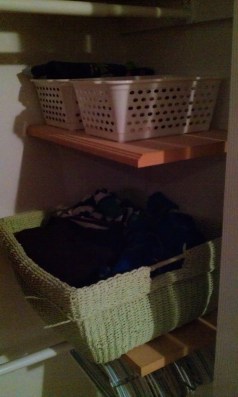 | He has a basket for jammies, a basket for socks, and one for swimsuits. Undies are kept in the linen closet with the cloth diapers. |