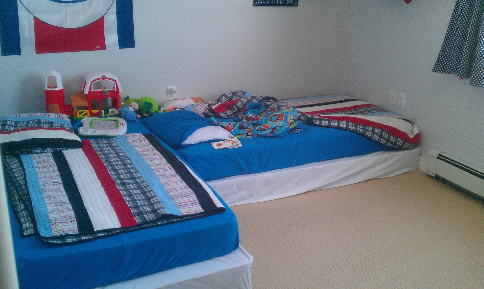 | For months now, D has insisted on sleeping UNDER one of his twin beds, and we want him to get comfortable sleeping IN a bed again. So Darling Husband dismantled the frames and created this cozy “floor bed.” He’s been sleeping here without a peep ever since. Yeah, it doesn’t look as cute as twin beds, but I’ll take it for now. WIN! |