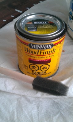 I bought an eight-foot board at our local home improvement store, had Darling Husband chop off about a foot (so it would fit in a specific spot in our basement), and got to work staining it a beautiful deep red.