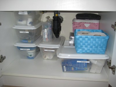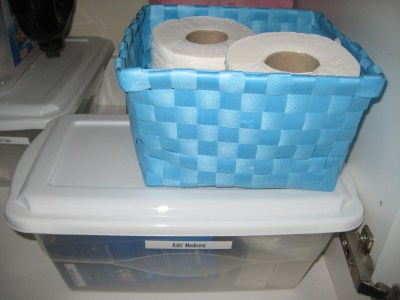 | The kids’ medicine is stored in this bin — the whole cabinet has a childproof lock on it, so no worries — and the little blue basket contains extra TP. All of the liquid soap refills are now stored in the kitchen cabinet, as you saw last week when I tackled the kitchen/main floor. |