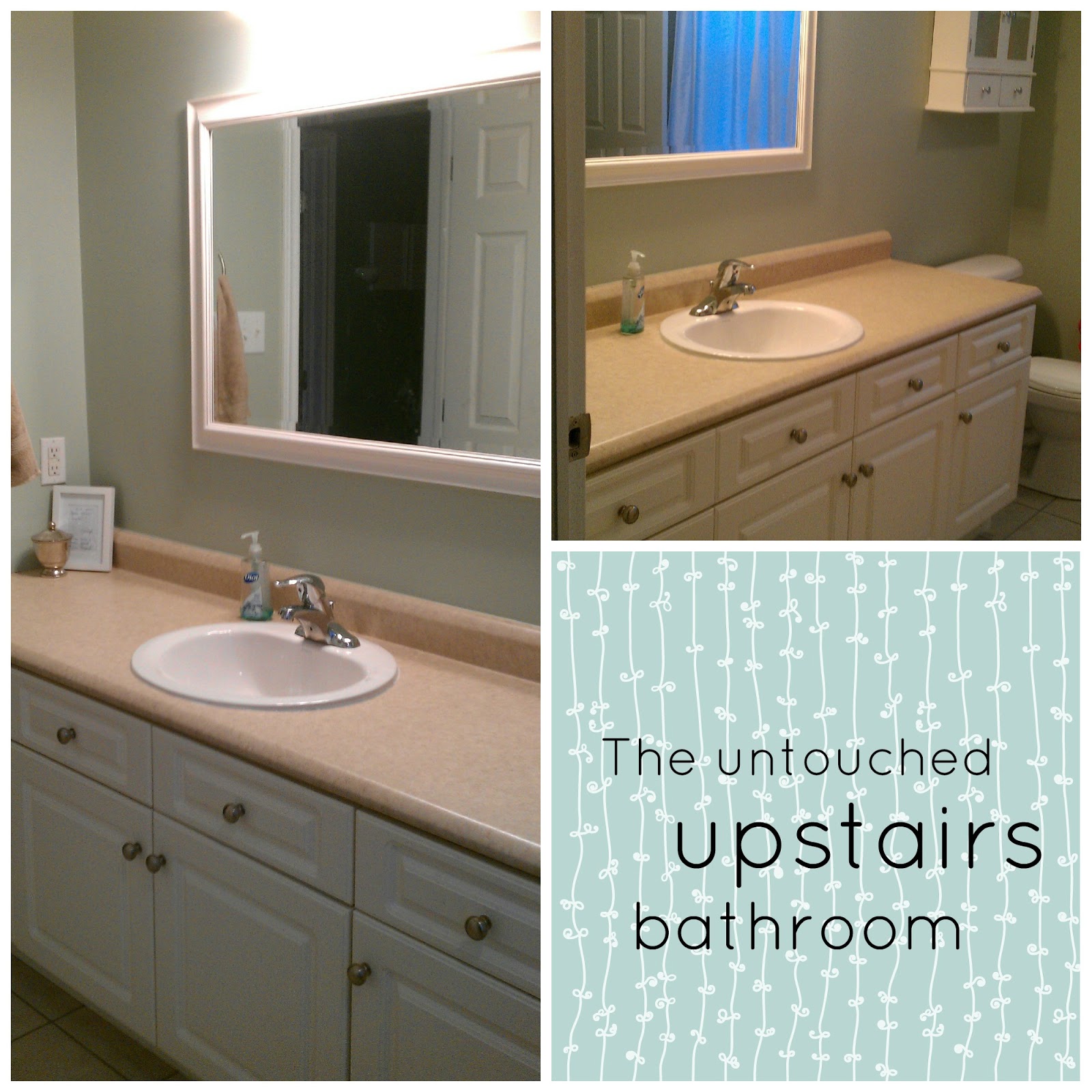P.S. In the interest of bathroom fairness, I’ll show you our other two bathrooms (even though they didn’t get the star treatment this week). But just know that they’re both in “move-in” condition — we’ve done nothing except hang one photo (in the basement bathroom), and make a piece of dental-themed homemade art (for the upstairs bathroom).
